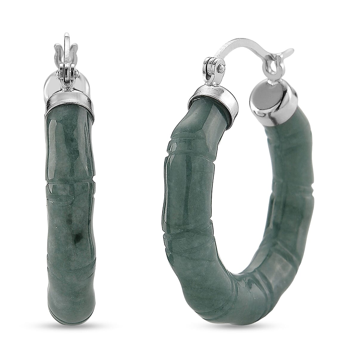 D'Joy Natural Olmec Jadeite 40.00 ctw Bamboo Hoop Earrings in Rhodium Over Sterling Silver
