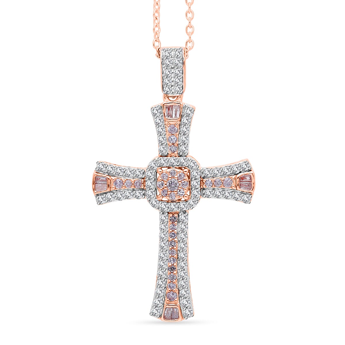 D'Joy Natural Pink and White Diamond 0.50 ctw Cross Pendant Necklace (20 Inches) in 18K Vermeil Rose Gold Over Sterling Silver