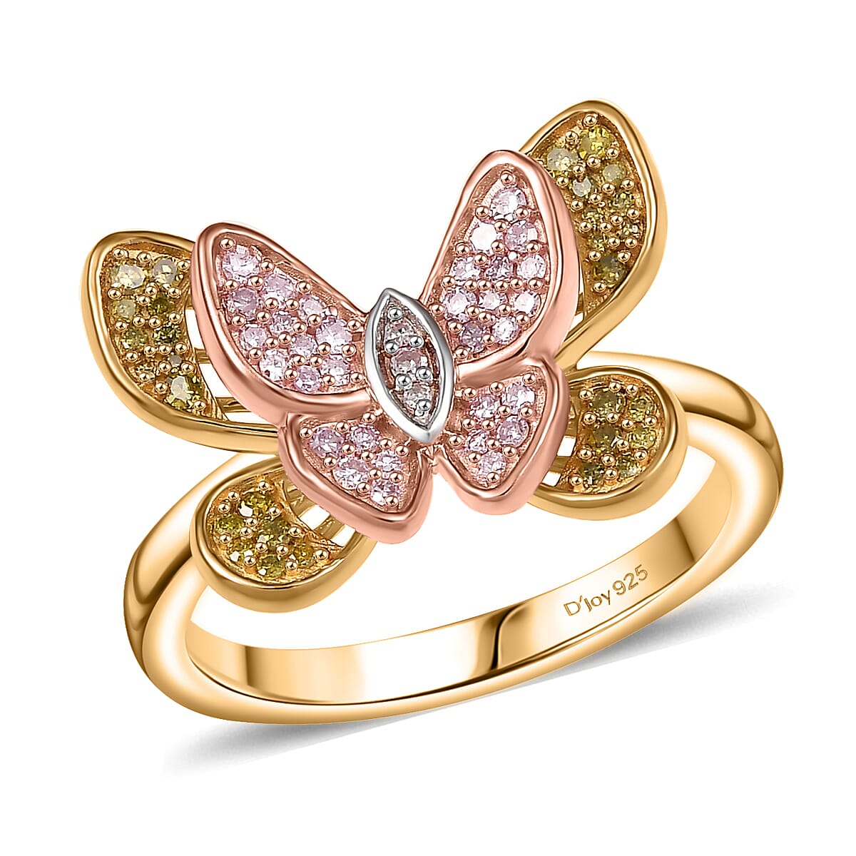 D'Joy Natural Pink, White and Yellow Diamond 0.33 ctw Butterfly Ring in 18K Vermeil Rose Gold and Yellow Gold Over Sterling Silver (Size 5.0)