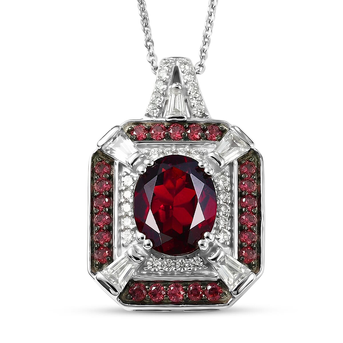 D'Joy Orissa Rhodolite Garnet and White Zircon 3.30 ctw Art Deco Pendant Necklace in Rhodium Over Sterling Silver 20 Inches
