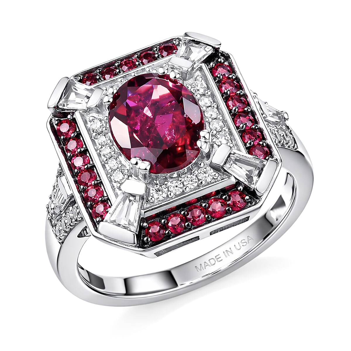 D'Joy Orissa Rhodolite Garnet and White Zircon 3.40 ctw Art Deco Ring in Rhodium Over Sterling Silver (Size 5.0)