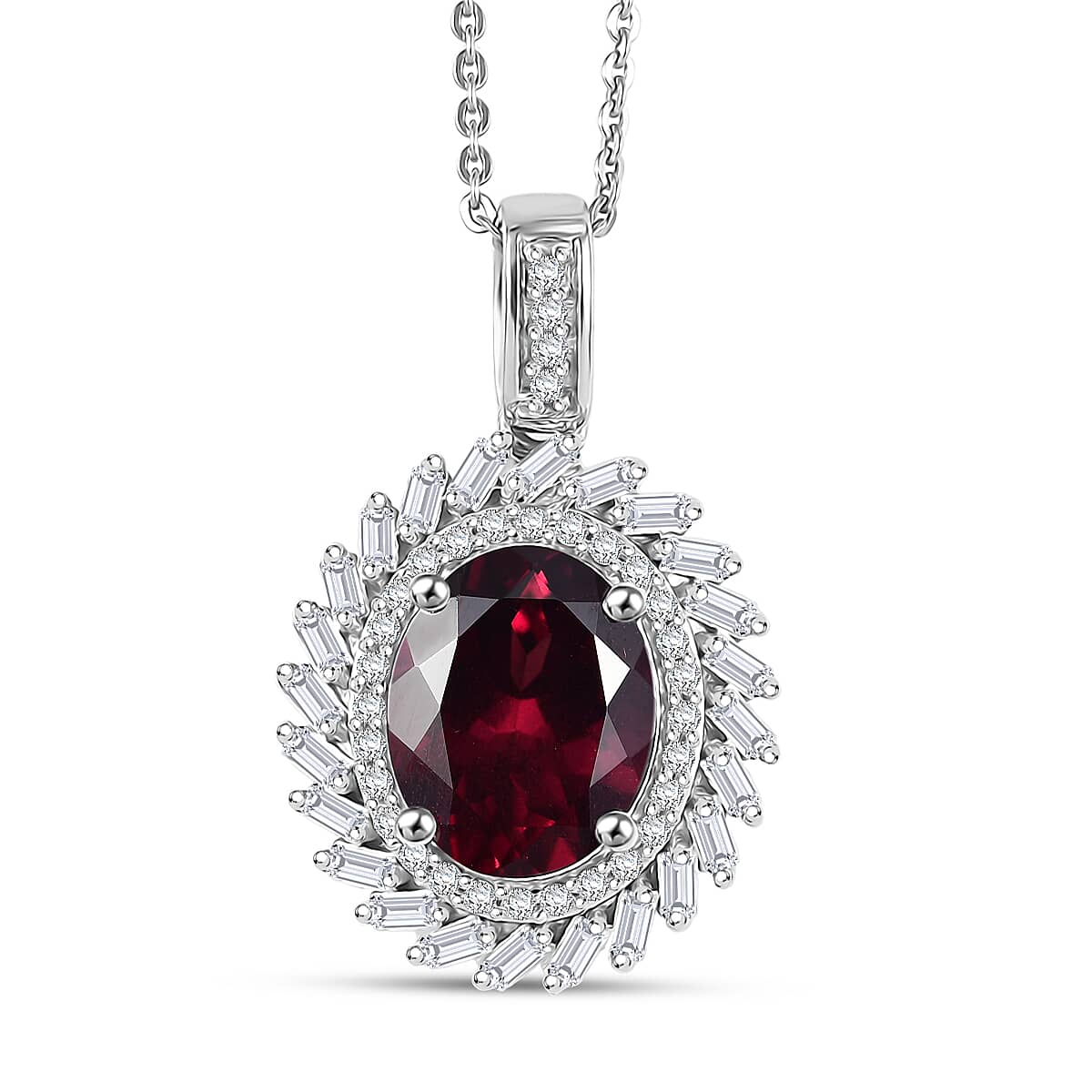 D'Joy Orissa Rhodolite Garnet, Moissanite Starburst Pendant Necklace in Rhodium Over Sterling Silver 11.10 ctw (20 Inches)