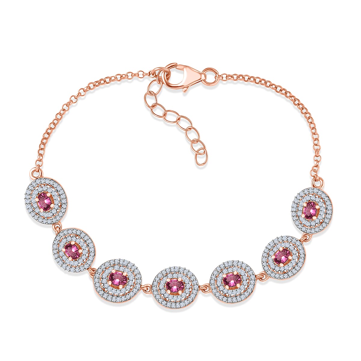 Refine your style with this D’Joy rubellite and moissanite scarlet halo bracelet in 925 sterling silver. This elegant fashion bracelet showcases vibrant Ouro Fino rubellite framed by sparkling moissanite accents. The rose gold vermeil finish adds warmth and romantic elegance.