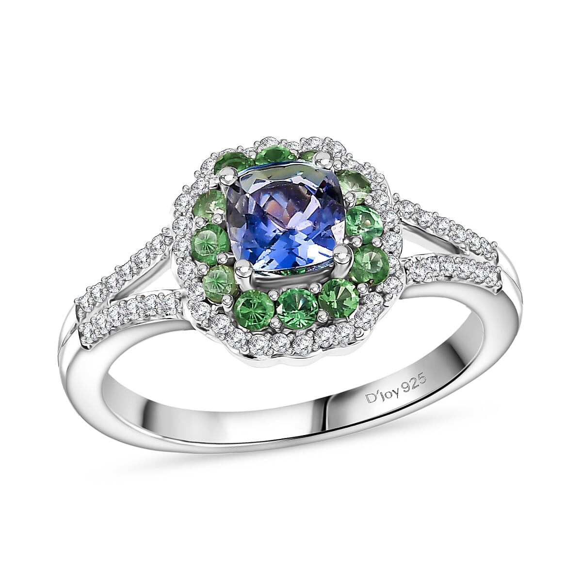 D'Joy Peacock Tanzanite and Multi Gemstone 1.30 ctw Blooming Flower Ring in Rhodium Over Sterling Silver (Size 9.0)