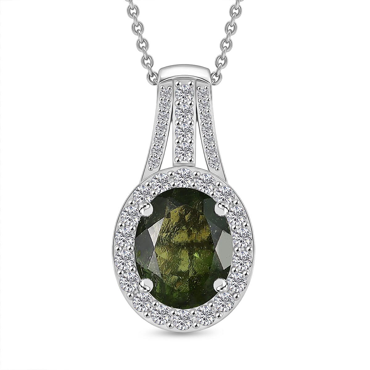 D'Joy Premium Bohemian Moldavite and White Zircon 2.85 ctw Pendant Necklace in Rhodium Over Sterling Silver (20 Inches)