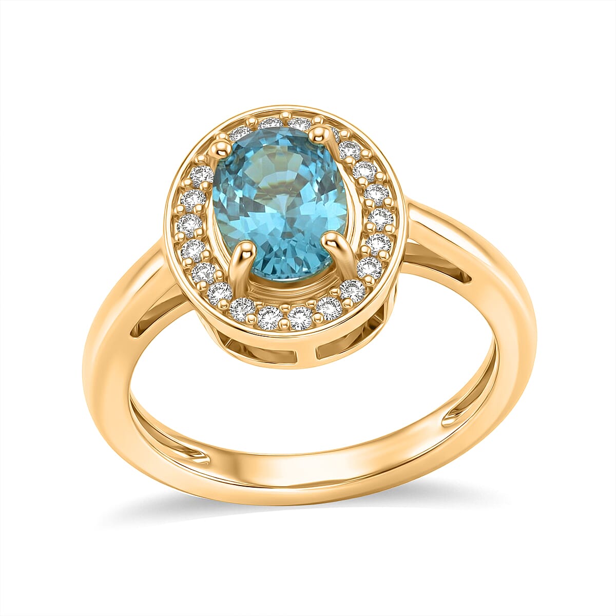 D'Joy Premium Cambodian Blue Zircon and Moissanite 2.10 ctw Ocean Glow Halo Ring in 18K Vermeil Yellow Gold Over Sterling Silver (Size 7.0) (Ships in 5-7 Days)