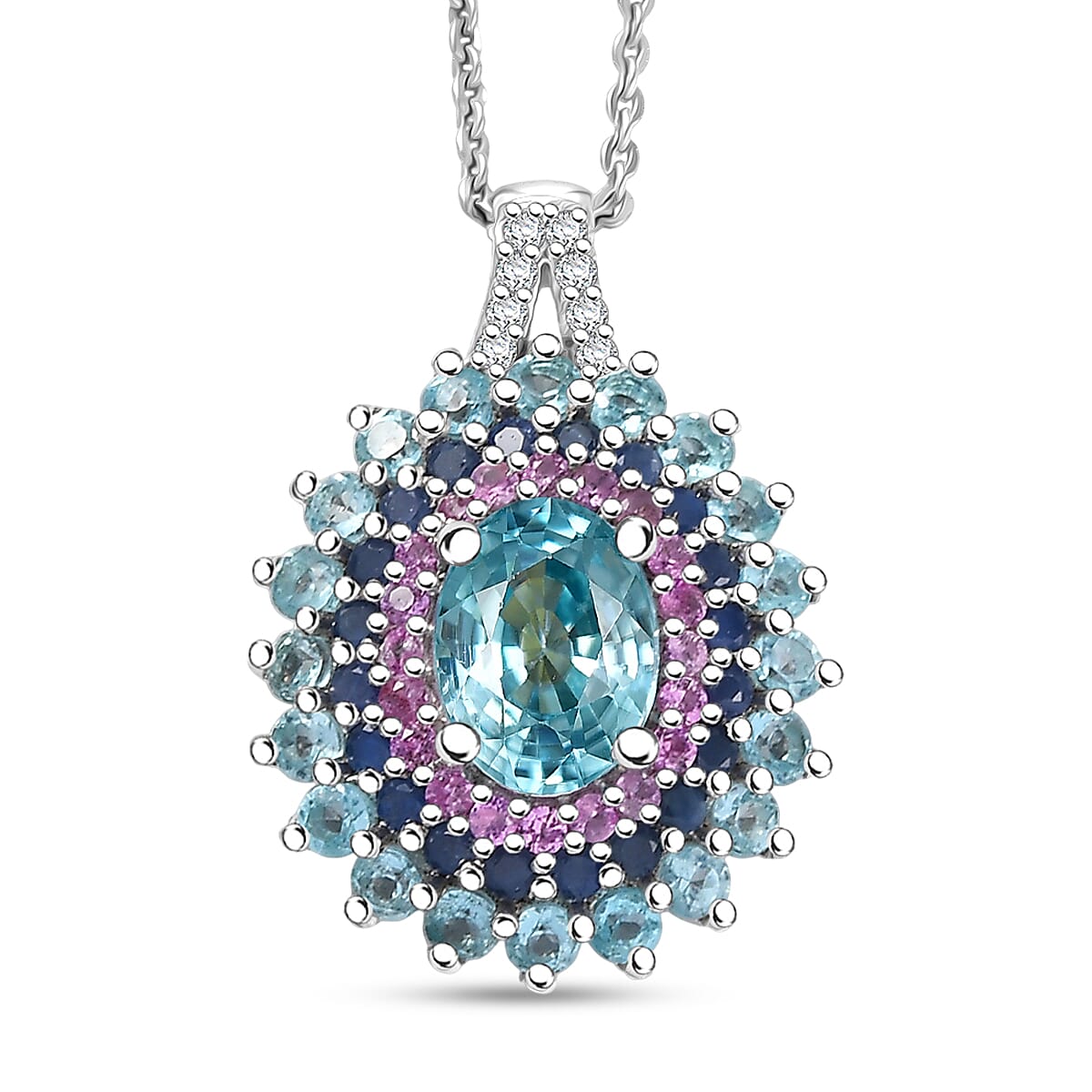D'Joy Premium Cambodian Blue Zircon and Multi Gemstone 3.40 ctw Oceanfire Majesty Pendant Necklace in Rhodium Over Sterling Silver 20 Inches