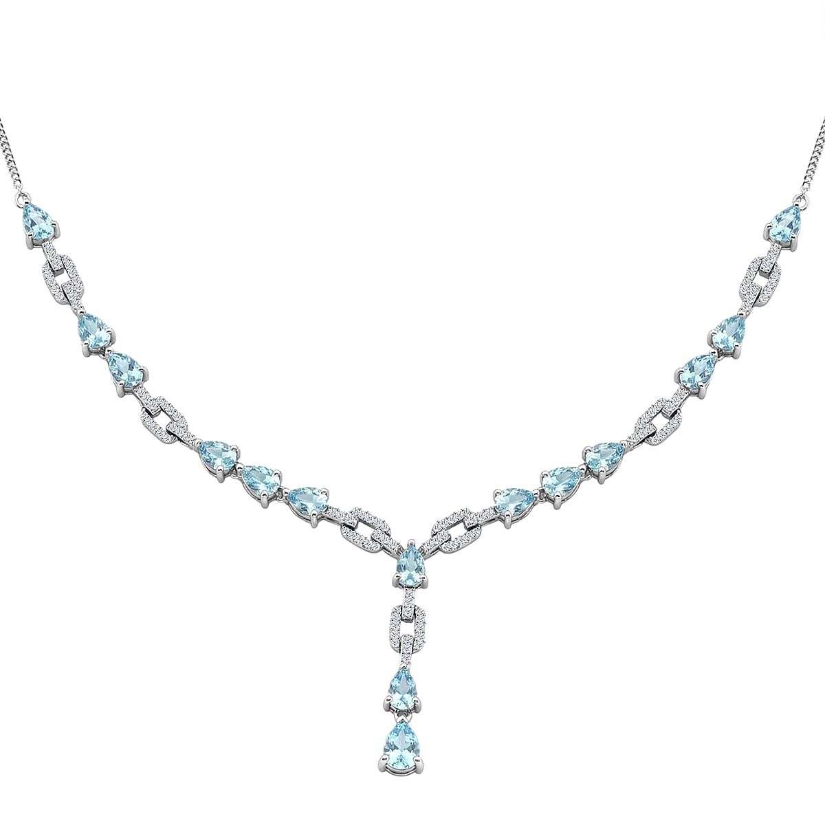 D'Joy Premium Cambodian Blue Zircon and White Zircon 11.30 ctw Ocean Cascade Necklace in Rhodium Over Sterling Silver 18 Inches
