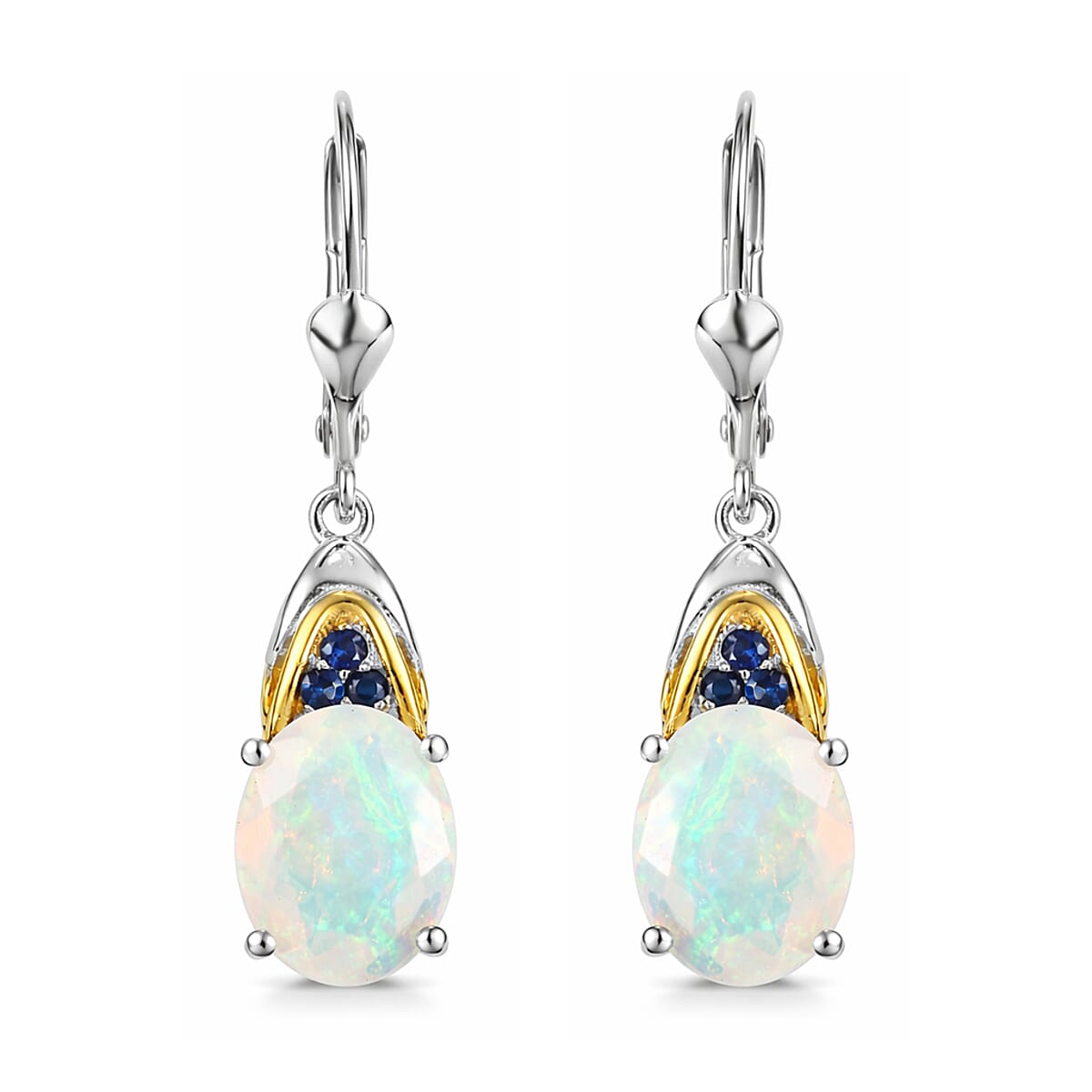 D'Joy Premium Ethiopian Welo Opal and Ceylon Blue Sapphire 3.35 ctw Aurora Leaf Crest Earrings in 18K Vermeil YG and Rhodium Over Sterling Silver
