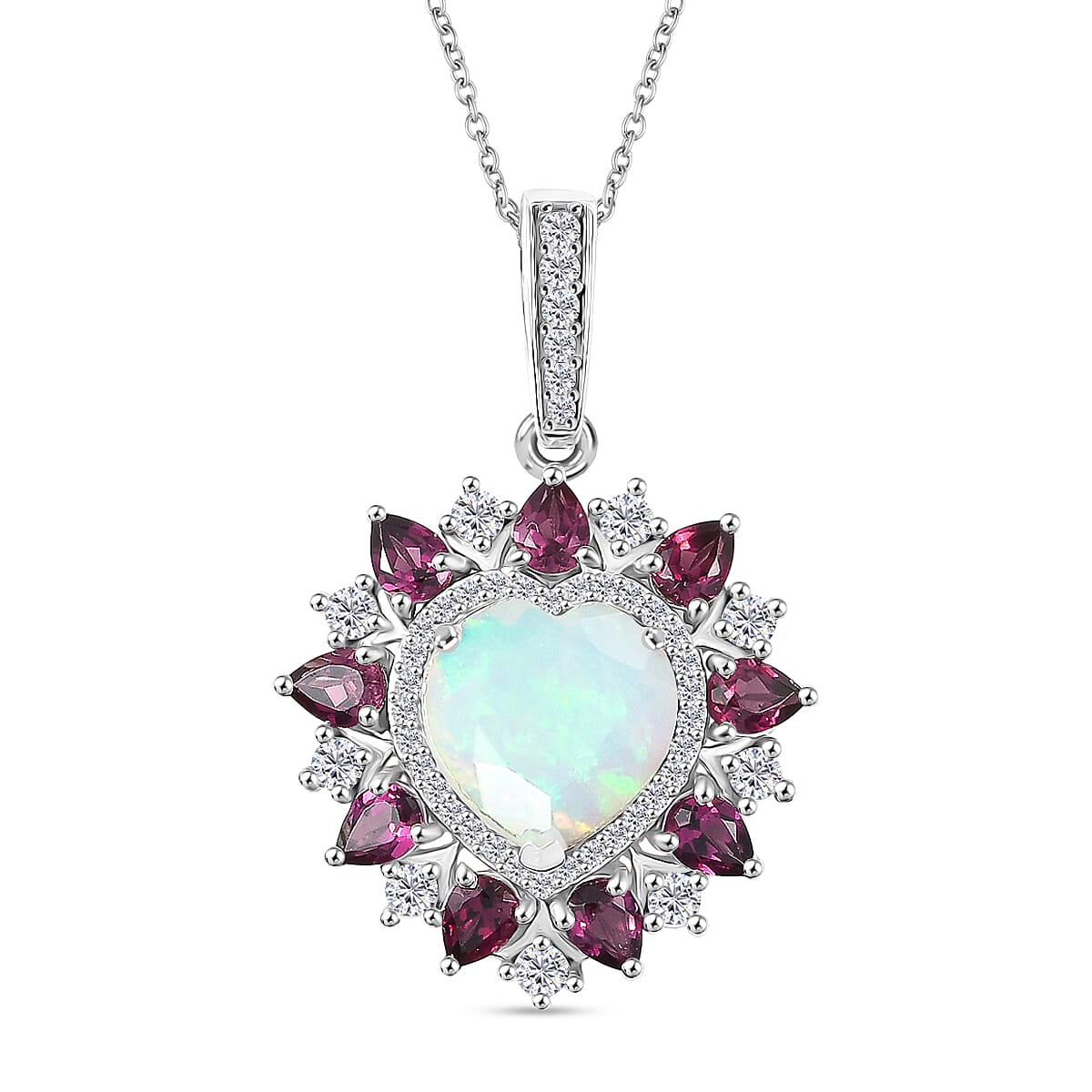 D'Joy Premium Ethiopian Welo Opal and Multi Gemstone 4.70 ctw Radiant Heart Pendant Necklace in Rhodium Over Sterling Silver 20 Inches