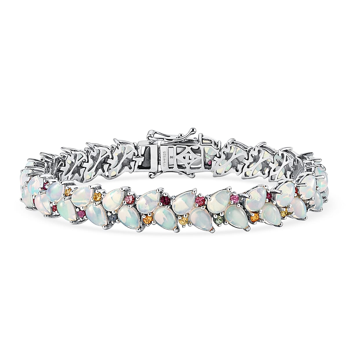 D'Joy Premium Ethiopian Welo Opal and Multi Sapphire 12.90 ctw Vine Leaf Bracelet in Rhodium Over Sterling Silver (6.50 In)