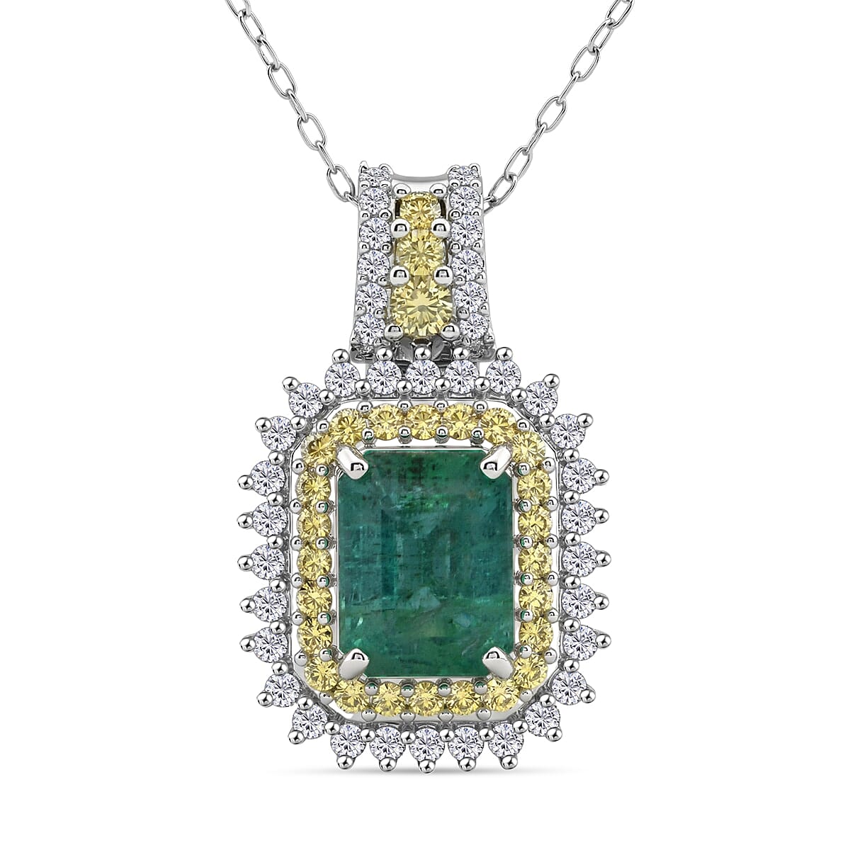 D'Joy Premium Kagem Zambian Emerald and Multi Gemstone 2.25 ctw Regal Halo Pendant Necklace in Rhodium Over Sterling Silver 20 Inches