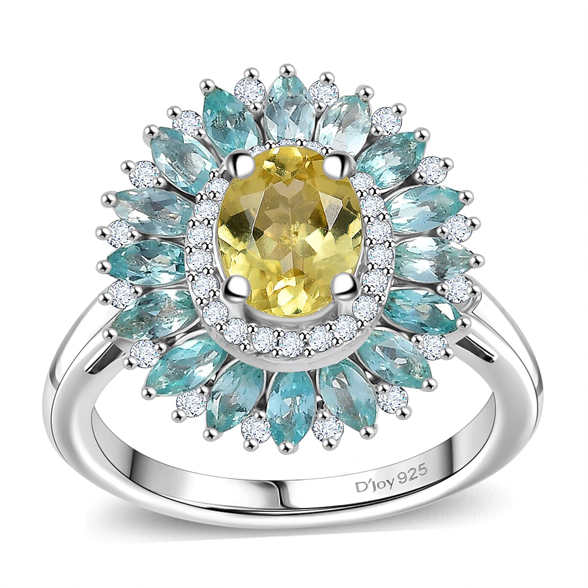 D'Joy Premium Madagascar Yellow and Lagoon Apatite and Moissanite 2.90 ctw Dahlia Flower Ring in Rhodium Over Sterling Silver (Size 8.0)
