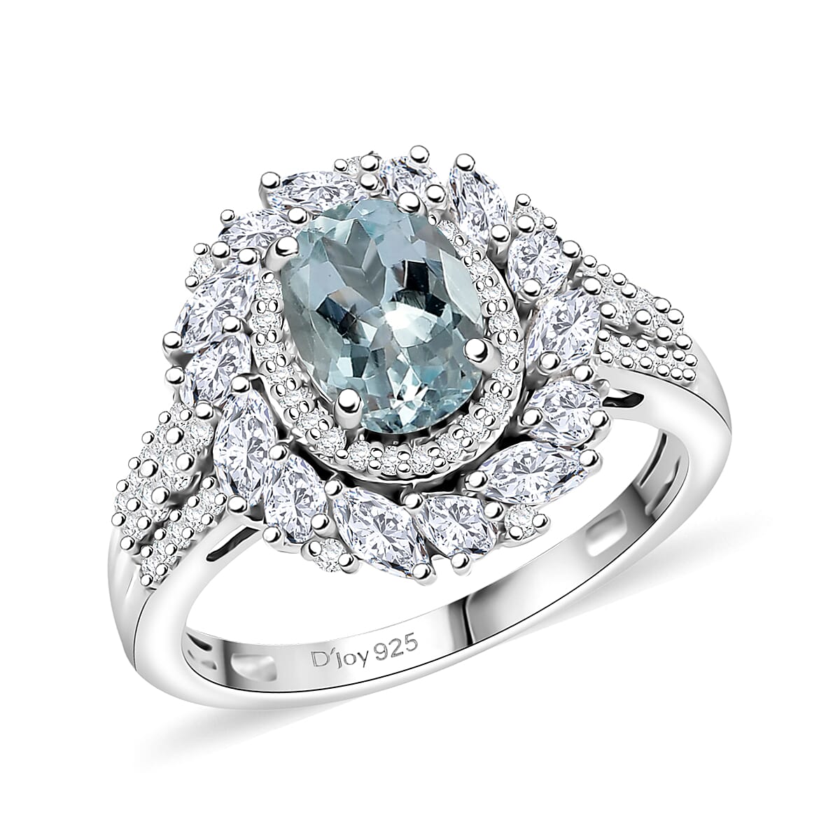 D'Joy Premium Mangoro Aquamarine and Moissanite 2.35 ctw Floral Burst Ring in Rhodium Over Sterling Silver (Size 7.0)