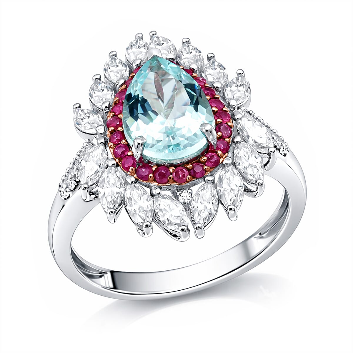 D'Joy Premium Mangoro Aquamarine and Multi Gemstone 3.00 ctw The Royal Bloom Ring in Rhodium Over Sterling Silver (Size 10.0) (Del. In 10-12 Days)