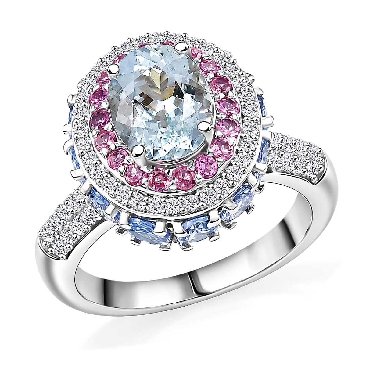 D'Joy Premium Mangoro Aquamarine and Multi Gemstone 4.20 ctw Lotus Flower Ring in Rhodium Over Sterling Silver (Size 10.0)