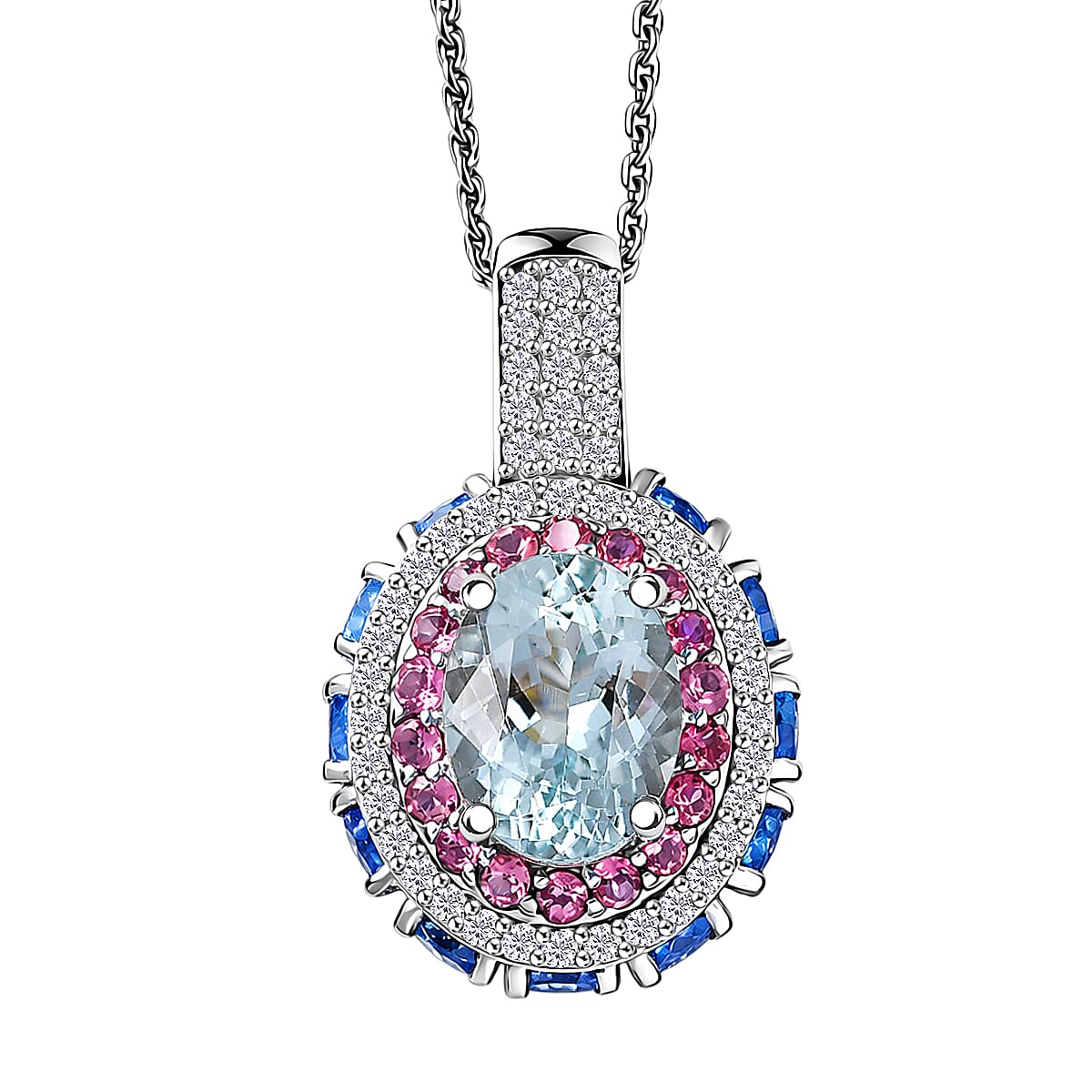 D'Joy Premium Mangoro Aquamarine and Multi Gemstone 4.30 ctw Lotus Flower Pendant Necklace in Rhodium Over Sterling Silver 20 Inches
