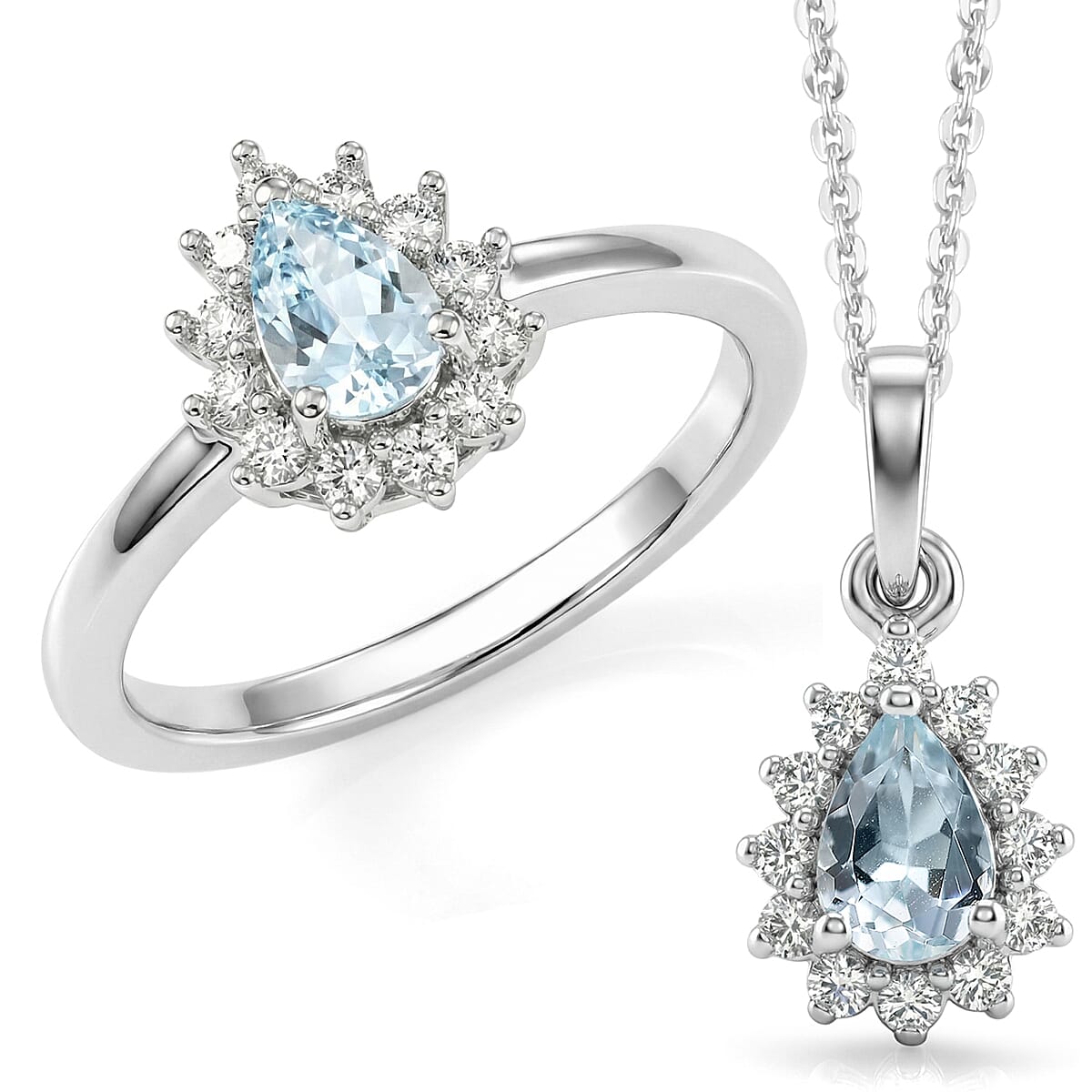 D'Joy Premium Mangoro Aquamarine and White Zircon 1.25 ctw Ring (Size 6.0) and Pendant Necklace (20 Inches) in Rhodium Over Sterling Silver(Del. In 10-12 Days)
