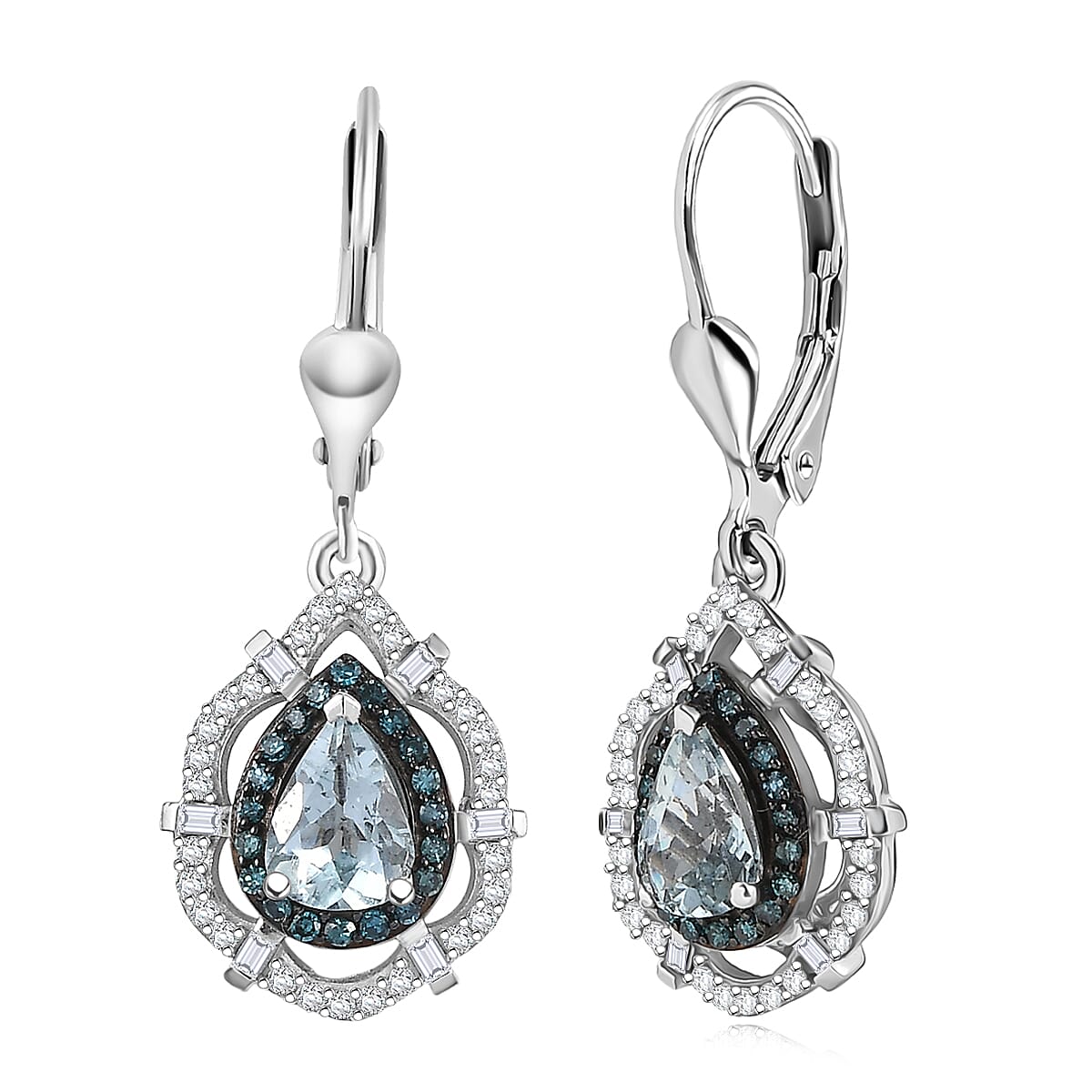 D'Joy Premium Mangoro Aquamarine, Blue Diamond (IR) and Diamond (0.54 cts) Earrings in Rhodium Over Sterling Silver 1.65 ctw