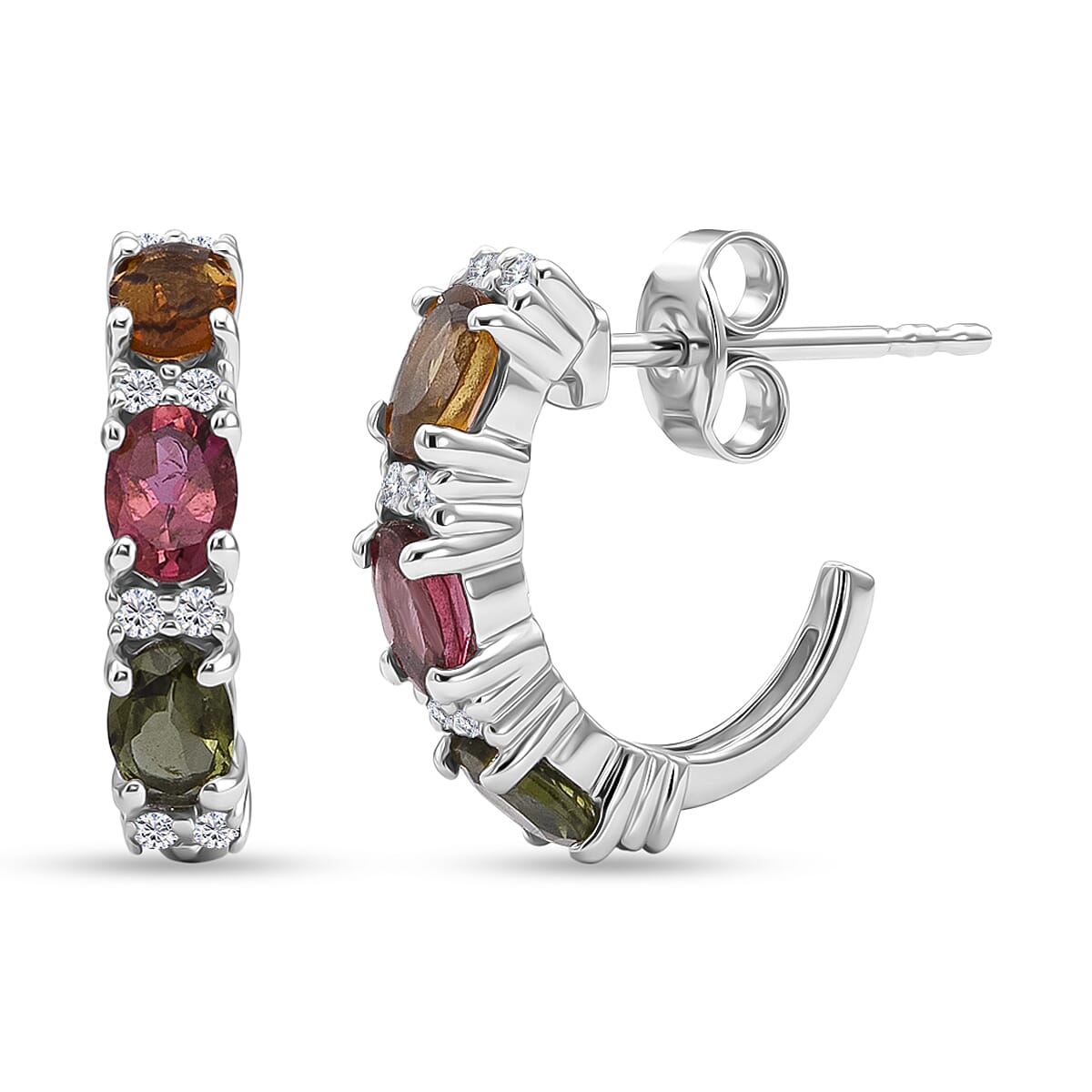 D'Joy Premium Multi-Tourmaline and White Zircon 1.20 ctw J-Hoop Earrings in Rhodium Over Sterling Silver (Del. In 10-12 Days)