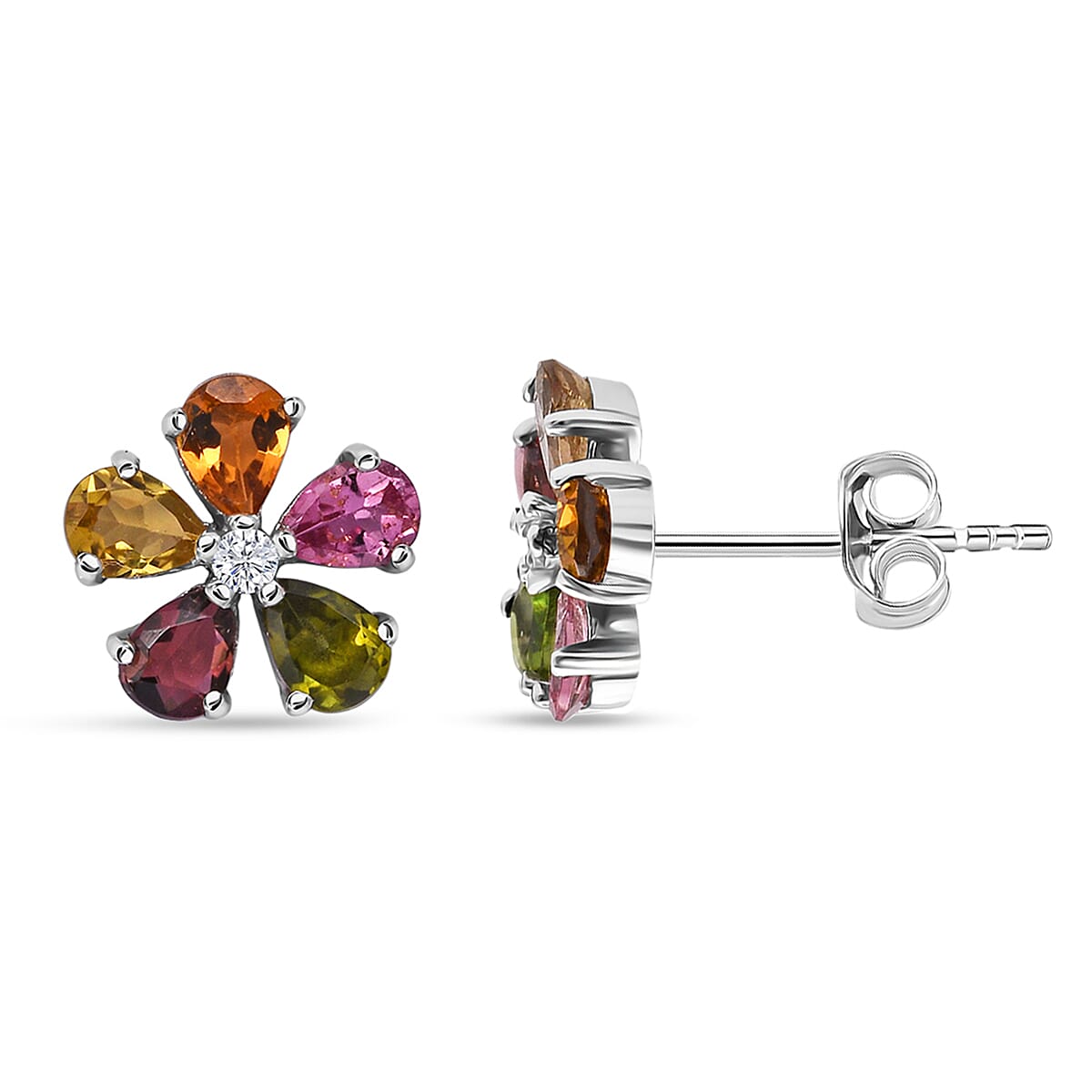 D'Joy Premium Multi-Tourmaline and White Zircon 1.60 ctw Colorburst Flower Stud Earrings in Rhodium Over Sterling Silver