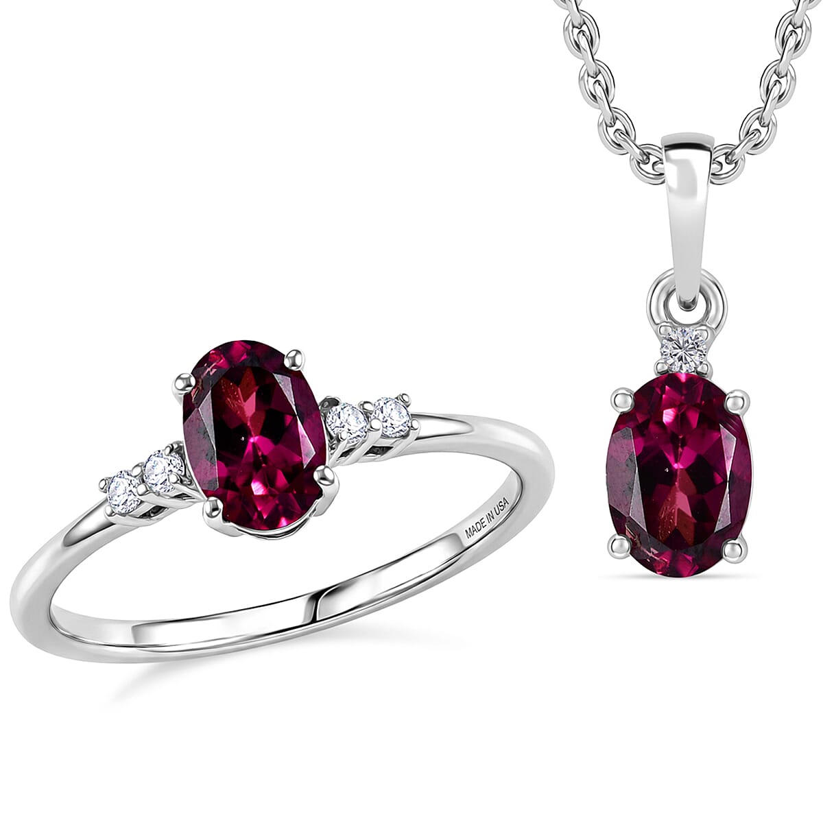 D'Joy Premium Orissa Rhodolite Garnet and Moissanite 2.15 ctw Box Set Ring (Size 9.0), Pendant Necklace 20 Inches in Rhodium Over Sterling Silver
