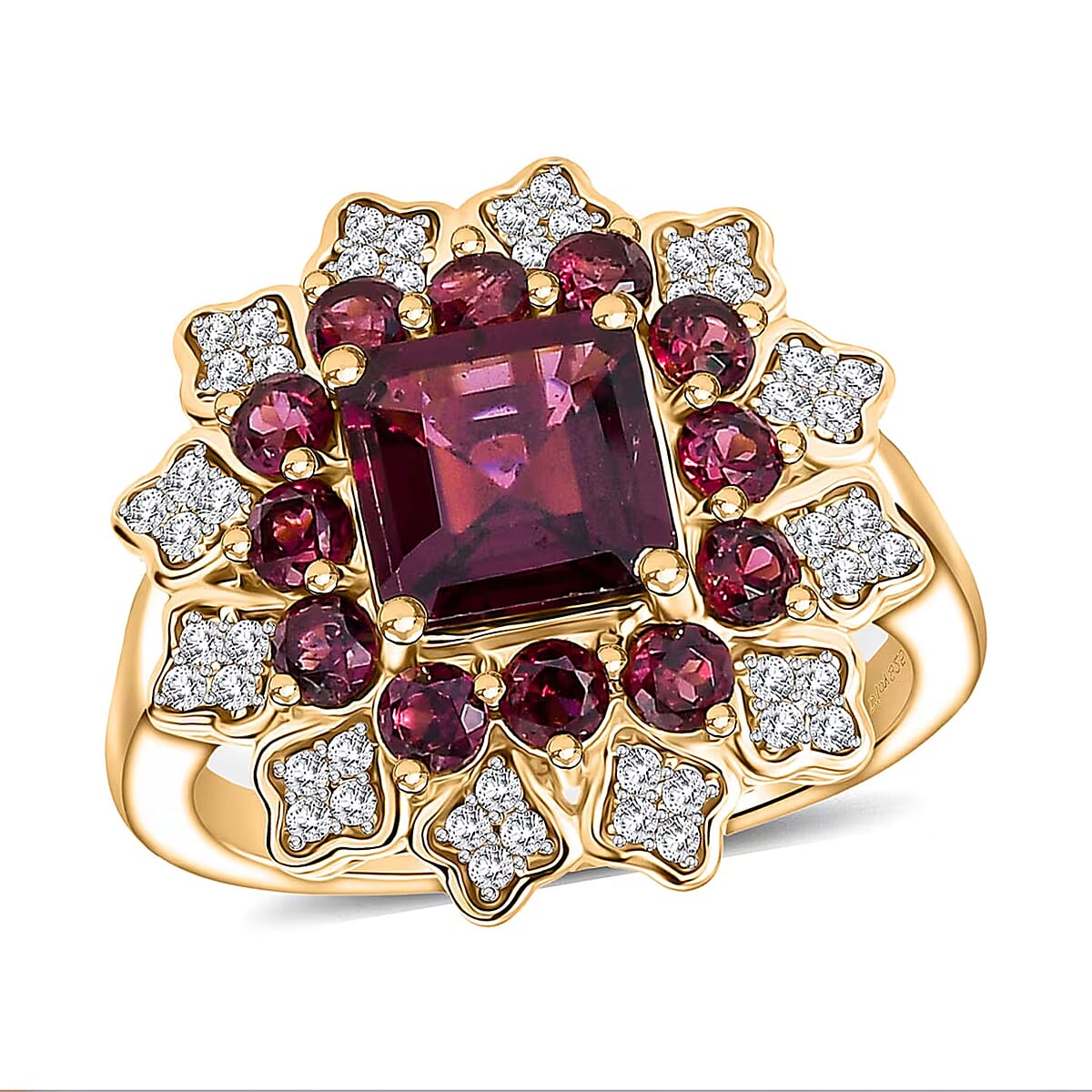 D'Joy Premium Orissa Rhodolite Garnet and White Zircon 3.50 ctw Ring in 18K Yellow Gold Plated Sterling Silver (Size 7.0)
