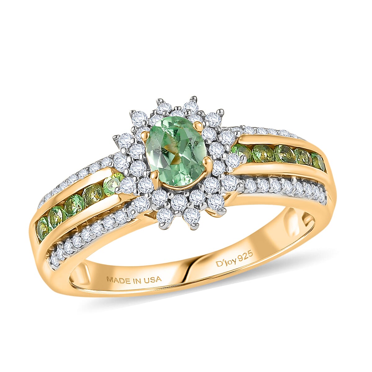 D'Joy Premium Tanzanian Mint Garnet and Moissanite 1.10 ctw Bloom Halo Ring in 18K Vermeil Yellow Gold Over Sterling Silver (Size 10.0)