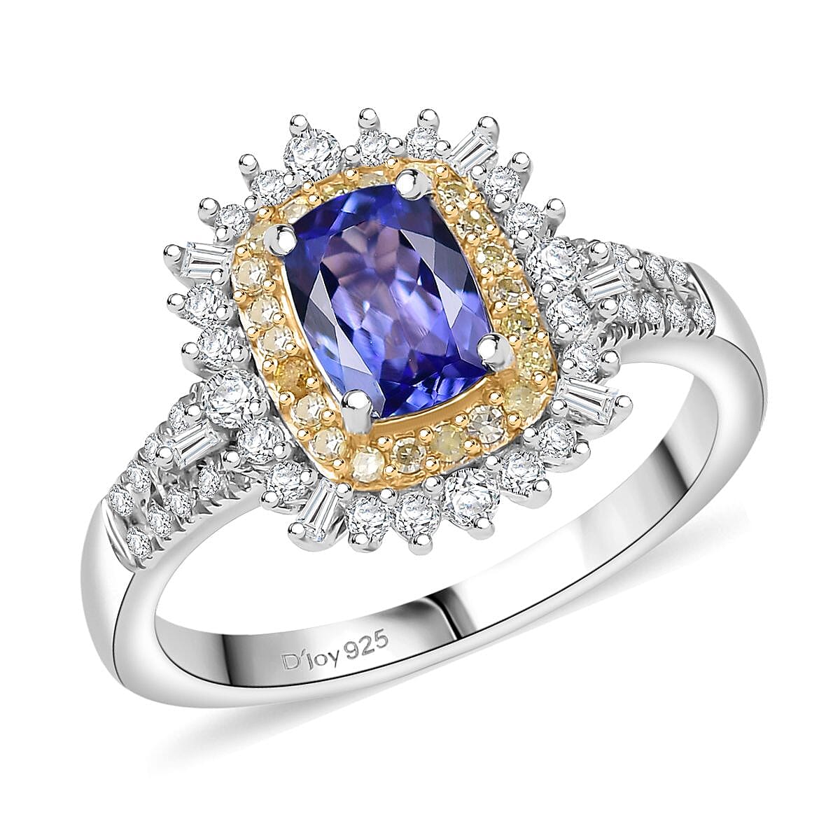 D'Joy Premium Tanzanite, Natural Yellow and White Diamond 1.30 ctw Sunburst Halo Ring in Rhodium Over Sterling Silver (Size 7.0)