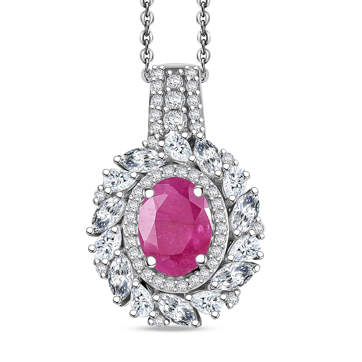 D'Joy Premium Taveta Ruby and Moissanite 2.80 ctw Floral Burst Pendant Necklace in Rhodium Over Sterling Silver 20 Inches