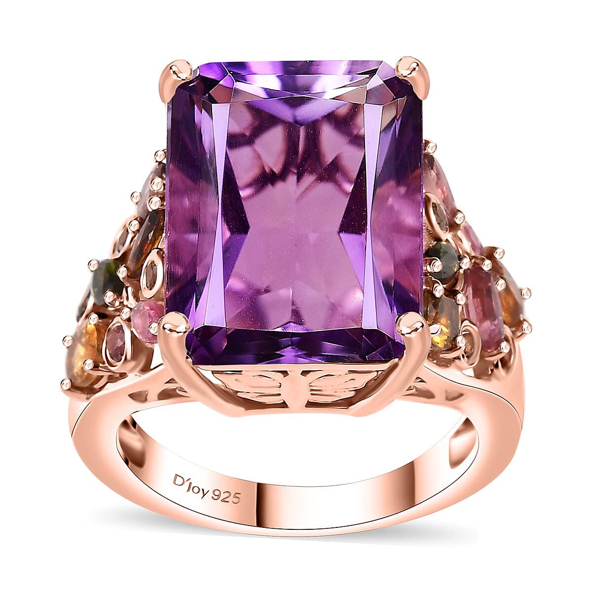 D'Joy Radiant Cut Rose De France Amethyst and Multi-Tourmaline 12.60 ctw Butterfly Ring in 18K Vermeil Rose Gold Over Sterling Silver (Size 10.0)