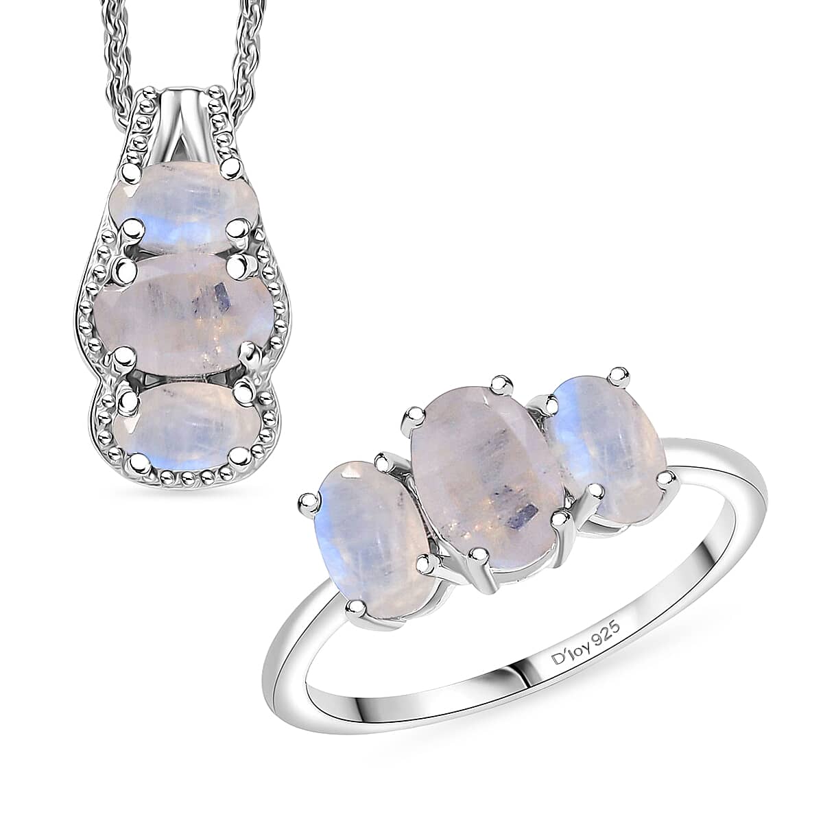 D'Joy Rainbow Moonstone 2.90 ctw Ring (Size 6.0) and Pendant Necklace 20 Inches in Rhodium Over Sterling Silver (Del. In 10-12 Days)