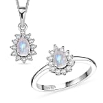 D'Joy Rainbow Moonstone, White Zircon 1.70 ctw Ring (Size 5.0) and Pendant Necklace 20 Inches in Rhodium Over Sterling Silver