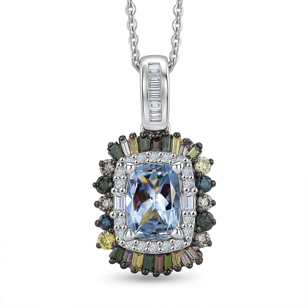 D'Joy Santa Maria Aquamarine and Multi Diamond 1.25 ctw Pendant Necklace in Rhodium Over Sterling Silver 20 Inches