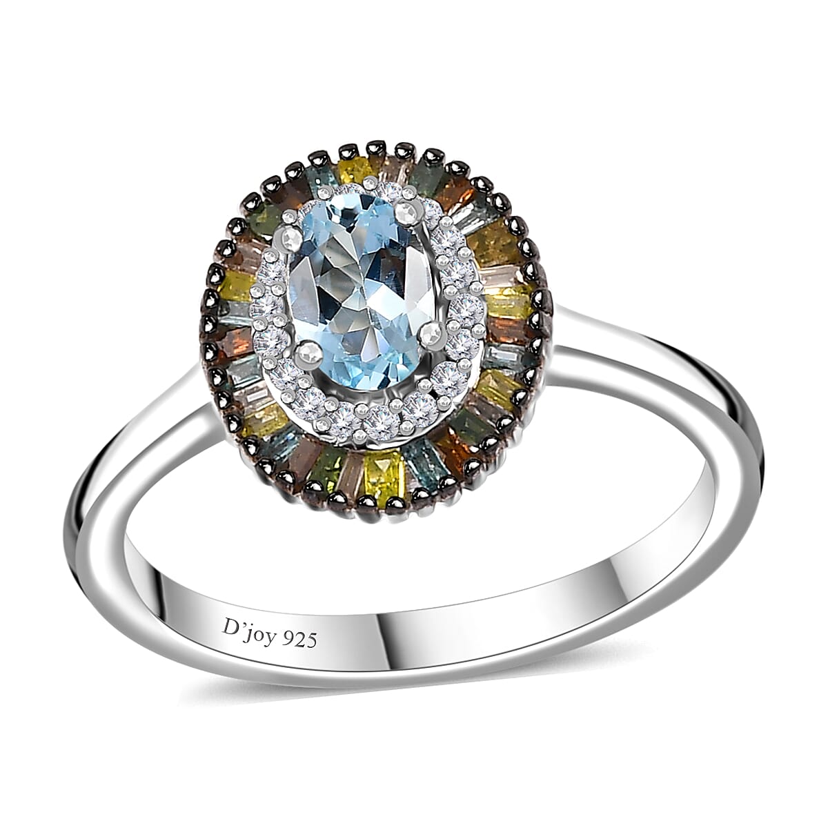 D'Joy Santa Maria Aquamarine and Multi Diamond Double Halo Rainbow Ring in Rhodium Over Sterling Silver (Size 9.0) 0.70 ctw