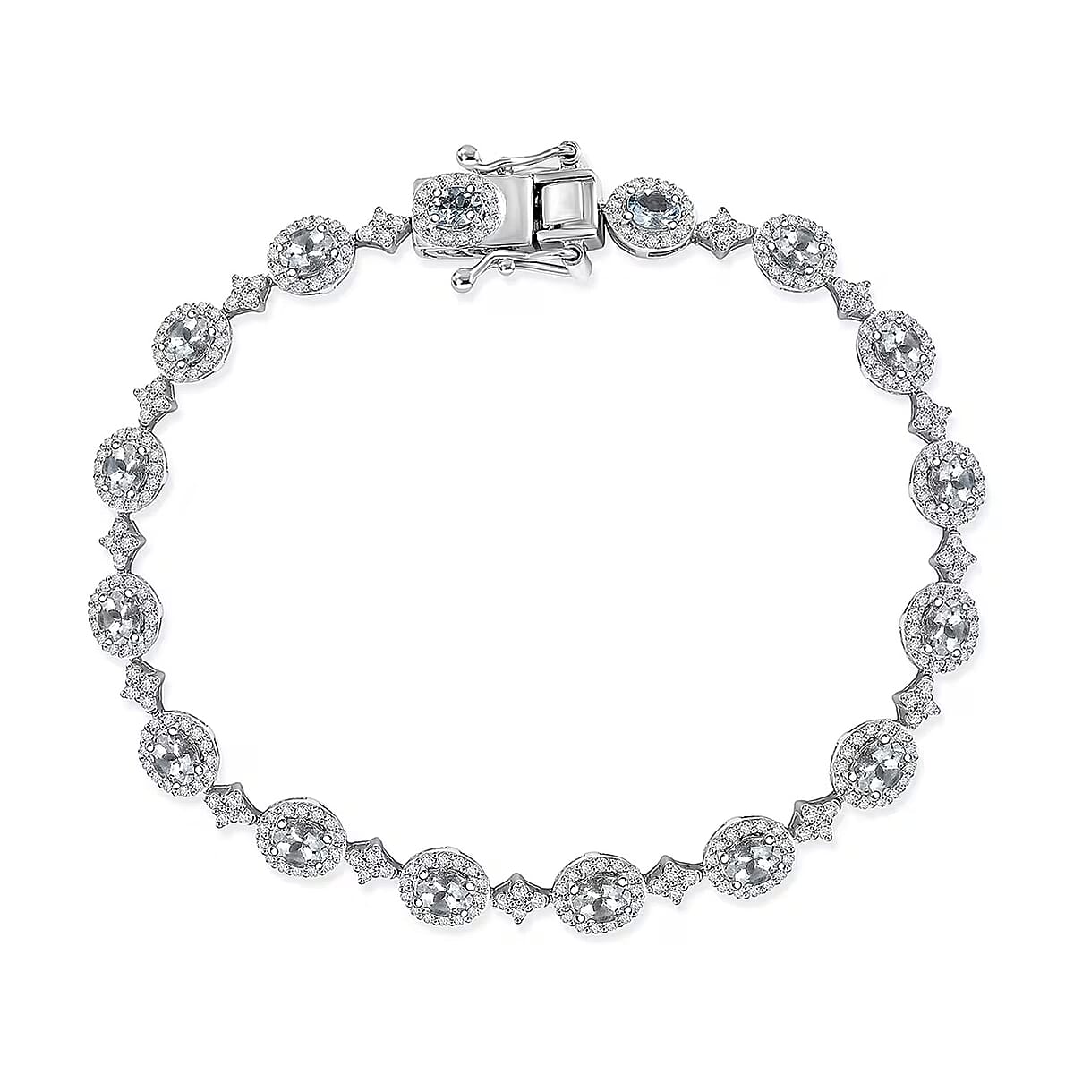 D'Joy Santa Maria Aquamarine, Moissanite 4.60 ctw Ocean Crown Bracelet in Rhodium Over Sterling Silver (7.25 In)