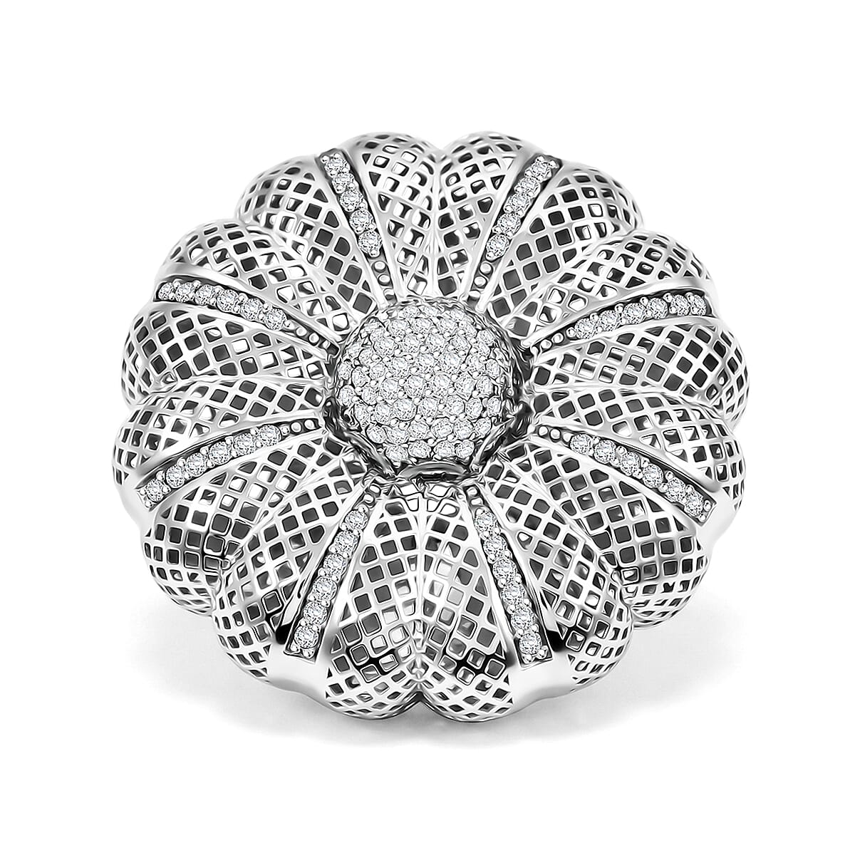 Enhance your style with this D’Joy simulated diamond ring in 925 sterling silver. This elegant floral ring sparkles with radiant brilliance and delicate petal detailing. Finished in rhodium, it offers lasting shine and refined sophistication.