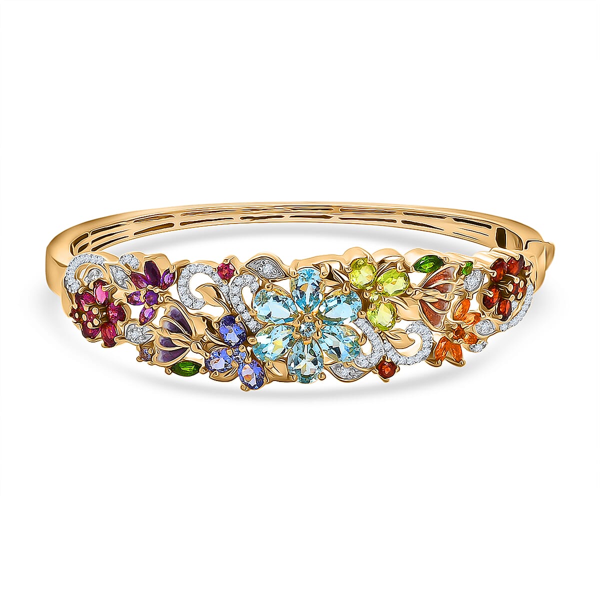 Elevate your look with this D’Joy sky blue topaz and multi-gemstone bracelet in 925 sterling silver. This elegant bangle bracelet features sparkling sky blue topaz paired with vibrant multi-gemstone accents. Finished in 18K yellow gold vermeil over sterling silver, it adds timeless elegance to any outfit.