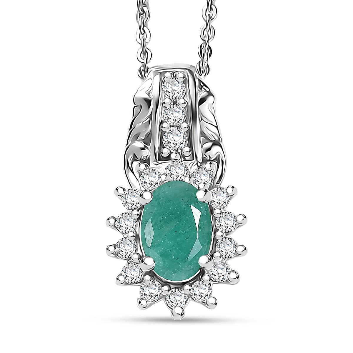 D'Joy Socoto Emerald and White Zircon 1.15 ctw Pendant Necklace in Rhodium Over Sterling Silver 20 Inches
