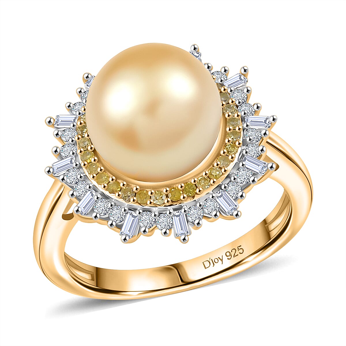D'Joy South Sea Golden Cultured Pearl, Natural Yellow and White Diamond 0.47 ctw Radiant Sunburst Ring in 18K Vermeil Yellow Gold Over Sterling Silver (Size 6.0)