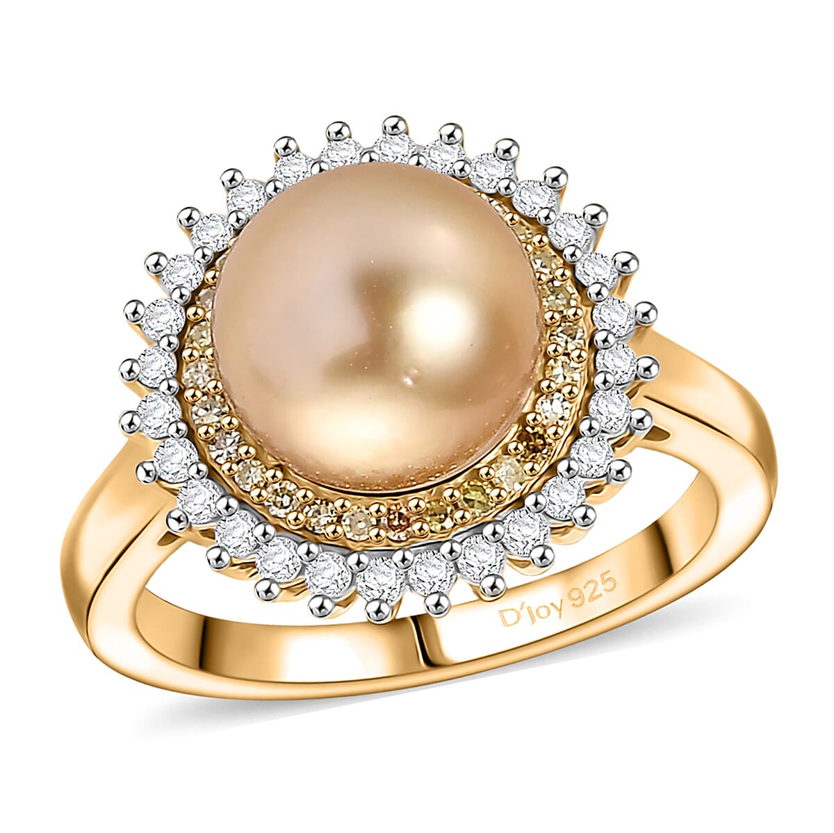 D'Joy South Sea Golden Pearl, Natural Yellow and White Diamond 0.45 ctw Sunburst Halo Ring in 18K Vermeil Yellow Gold Over Sterling Silver (Size 8.0)