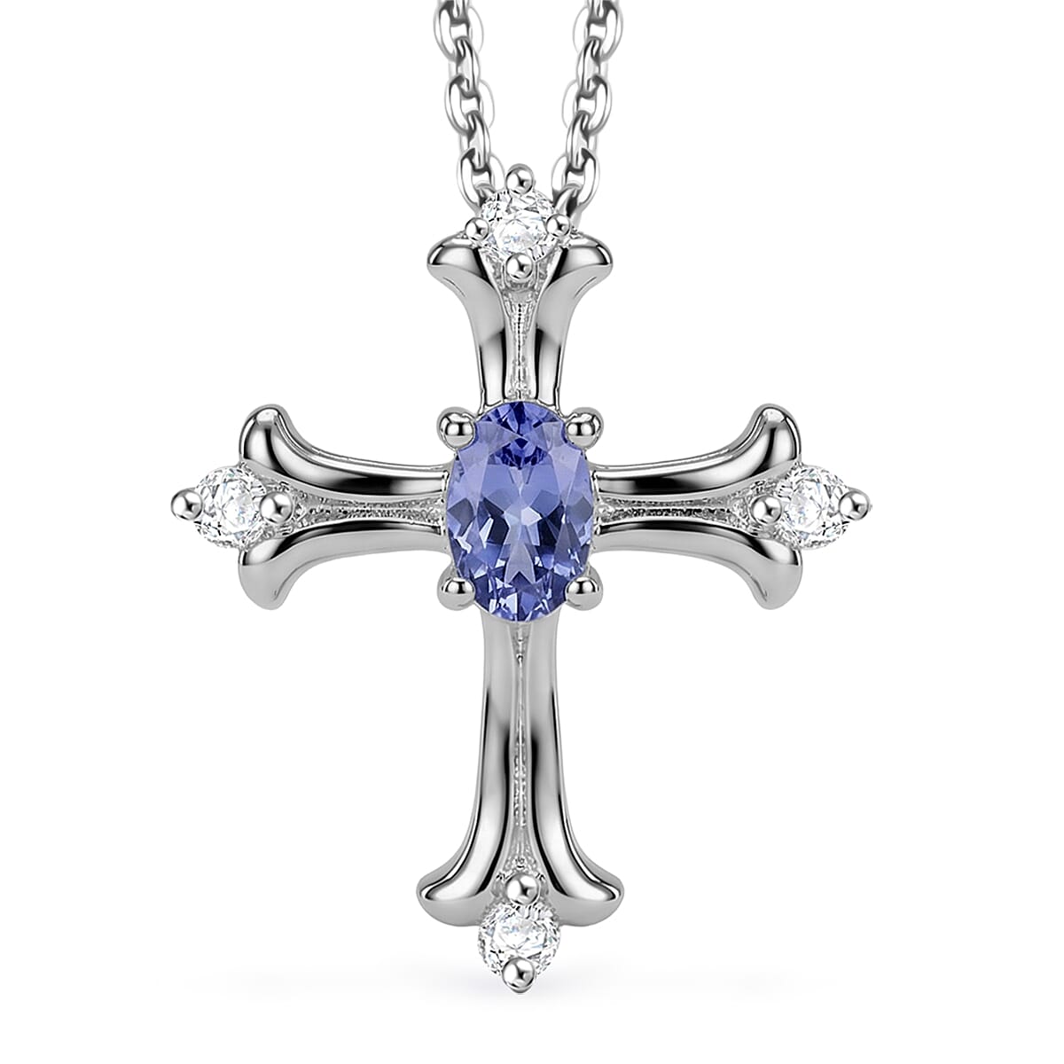 D'Joy Tanzanite and Moissanite 0.40 ctw Cross Pendant Necklace in Rhodium Over Sterling Silver 20 Inches
