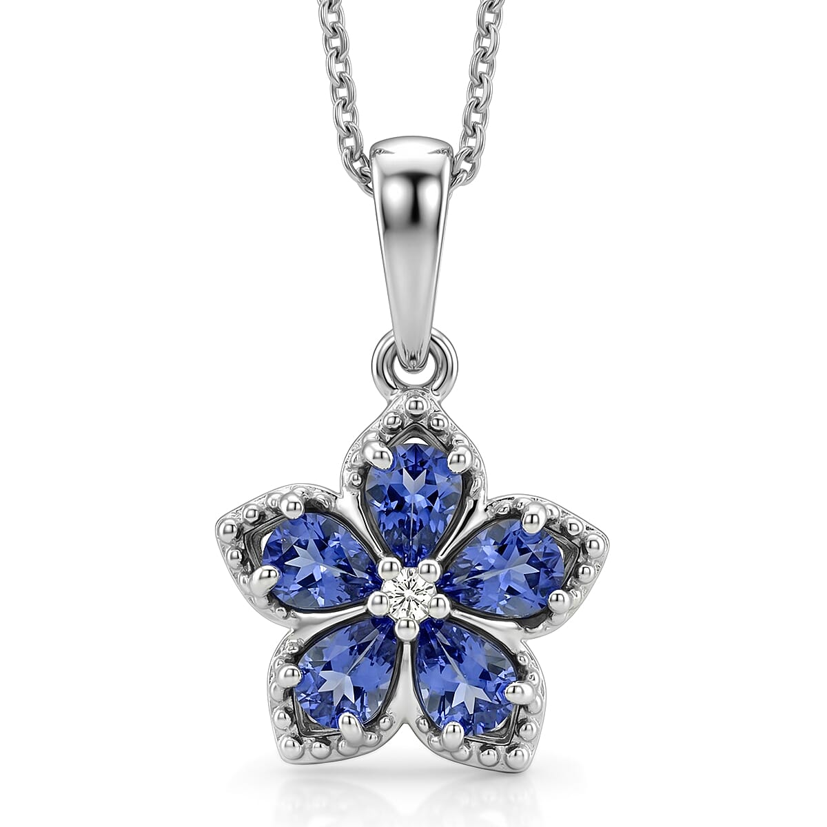 D'Joy Tanzanite and Moissanite 0.75 ctw Floral Bloom Pendant Necklace in Rhodium Over Sterling Silver 20 Inches