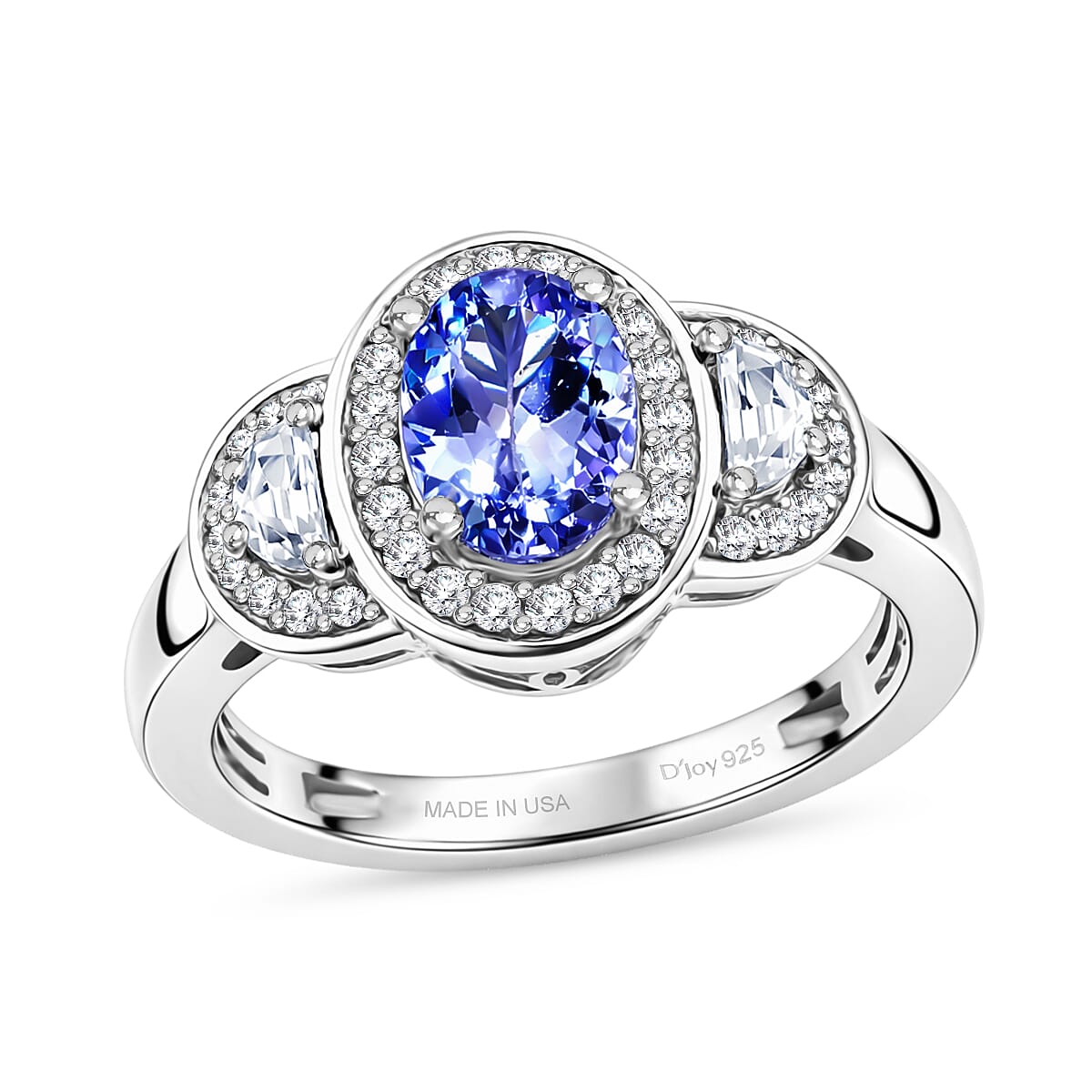 D'Joy Tanzanite and White Zircon 1.60 ctw Tri Stone Harmony Halo Ring in Rhodium Over Sterling Silver (Size 10.0)