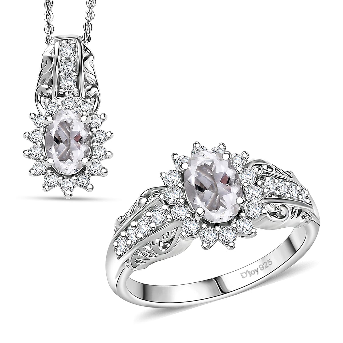 D'Joy White Topaz and White Zircon 2.30 ctw Ring (Size 7.0), and Pendant Necklace 20 Inches in Rhodium Over Sterling Silver