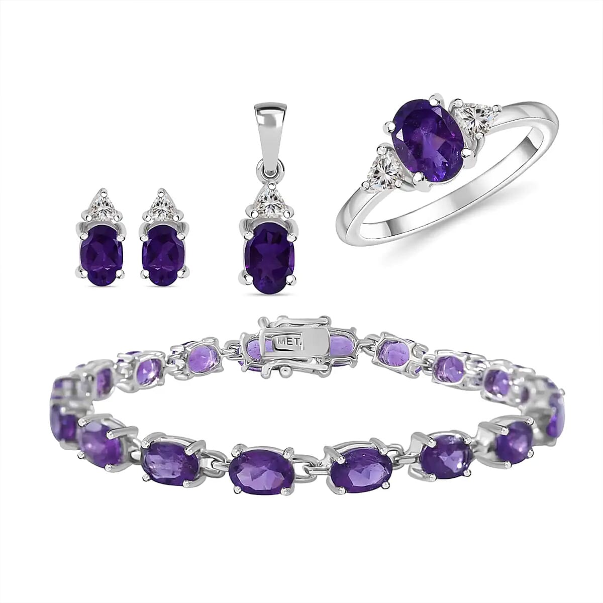 Doorbuster African Amethyst, White Topaz Ring , Earrings, Bracelet (7.25In) and Pendant in Platinum Over Sterling Silver 18.35 ctw