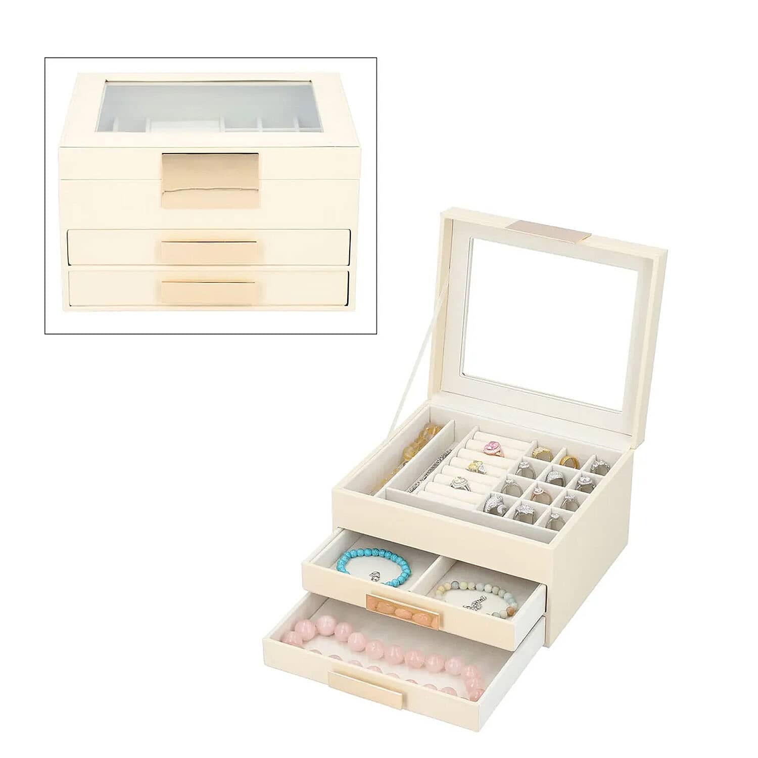 DOORBUSTER Beige Three Layer Faux Leather Jewelry Box with Anti Tarnish Lining and 2 Removable Tray (9.1"x8"x5.3")