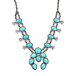 The blue howlite floral squash blossom necklace features a gems set in bezel. The intricate metalwork highlights craftsmanship across its 24-28 inch length, making it a versatile gift for loved ones.