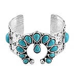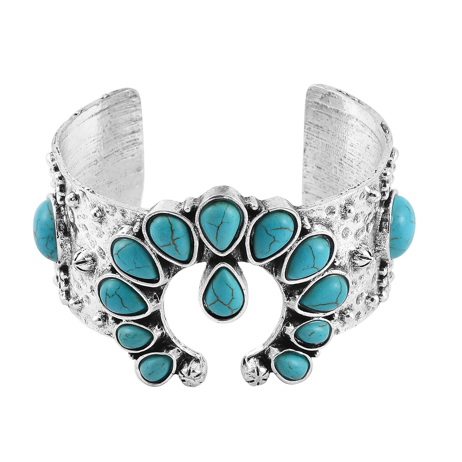 This cuff bracelet draws inspiration from the traditional squash blossom motif, integrating blue howlite gemstones for a striking look. It is crafted from a durable and affordable metal, designed for both appeal and longevity.