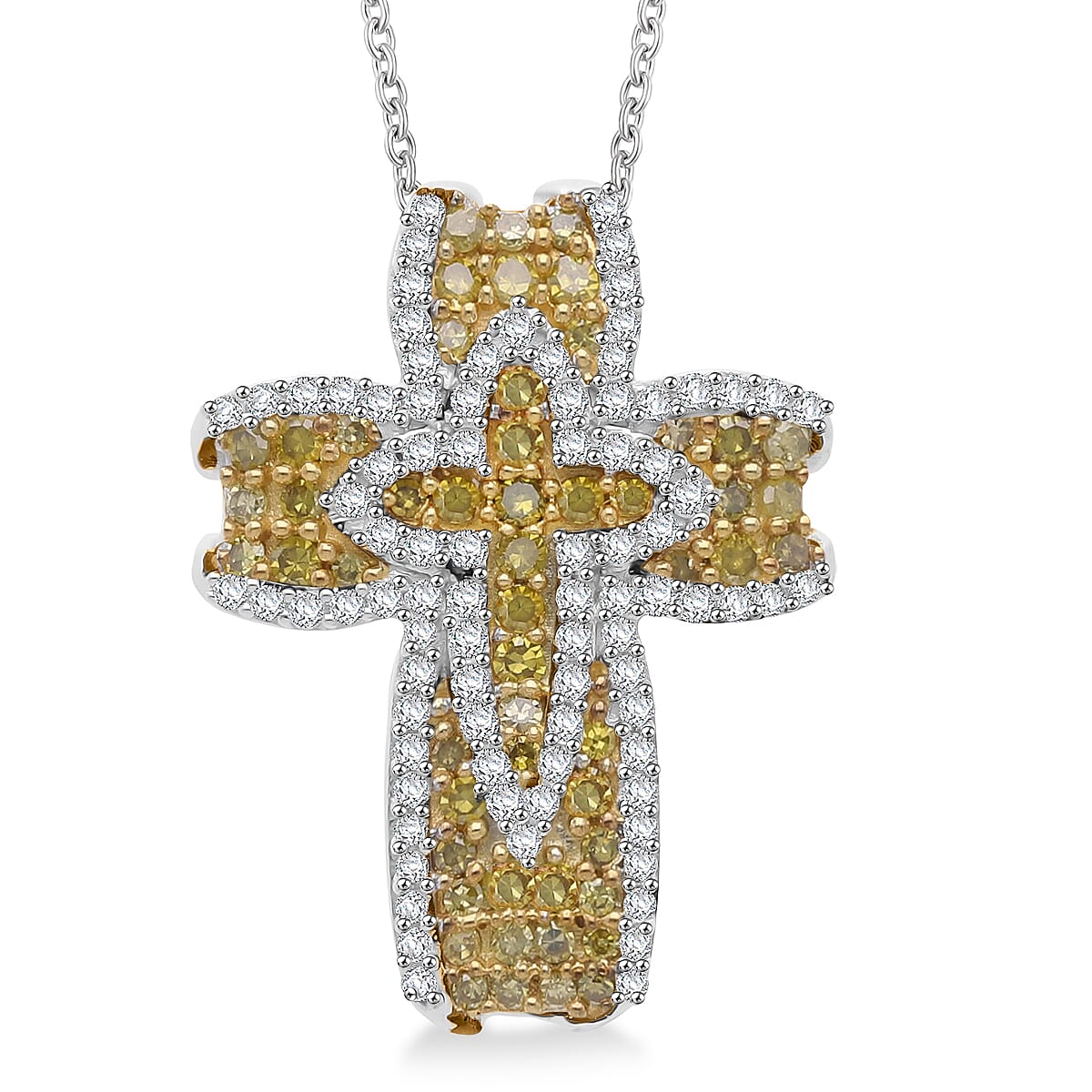 Doorbuster D'Joy Yellow and White Diamond 0.50 ctw Cross of Dual Blessings Pendant Necklace in Rhodium Over Sterling Silver 20 Inches